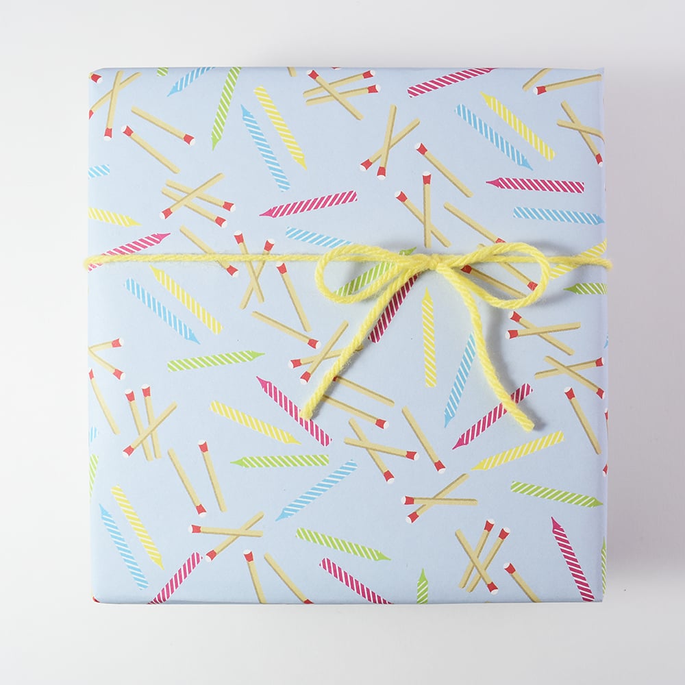 All you need is a slice of cake, and you're ready for a party with this candle and match print. Package a present or start a new craft project using City of Industry's gift wrap.