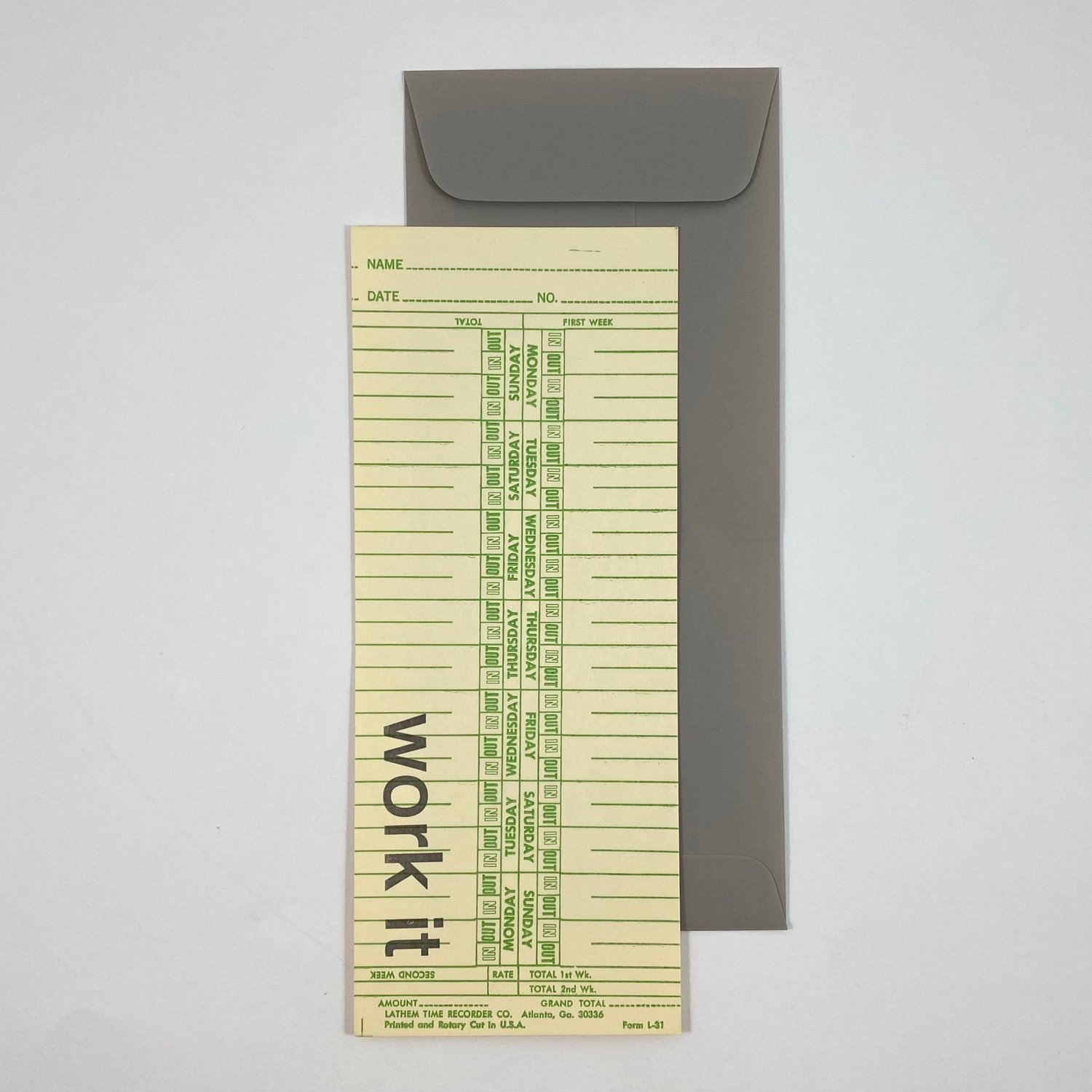 A playful timecard-inspired card. Flat card with gray envelope.
